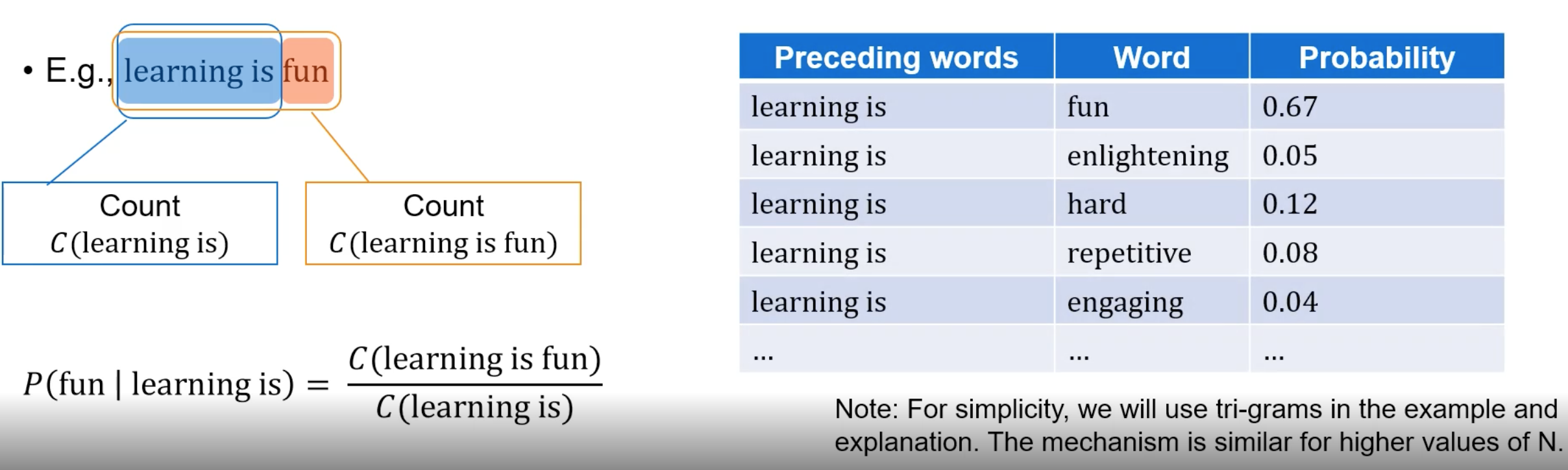 Simple approach to language model. Estimate the probability of the nth words based on the previous (n-1) words.