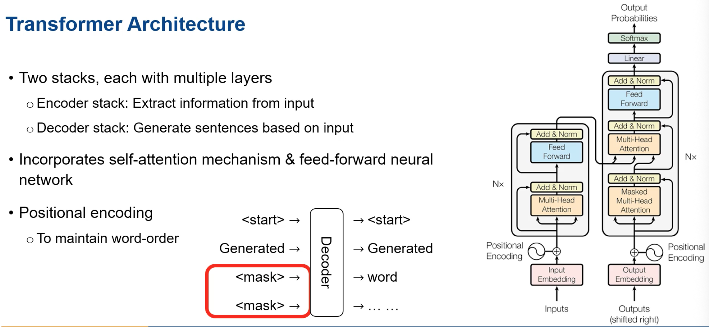 Encoder only: classification, sentiment analysis Decoder only: Text completion & Generation, image captioning